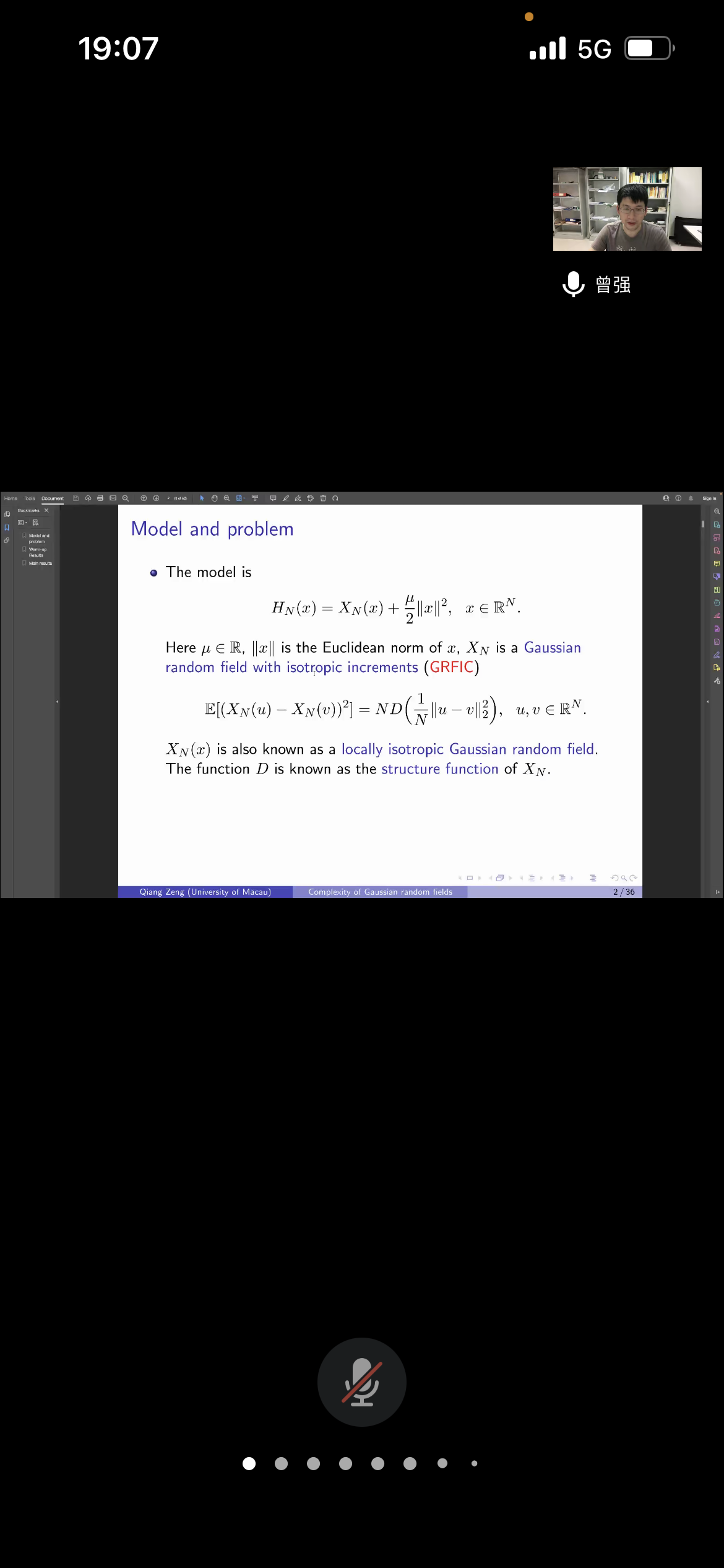 应数学与统计学院与粒计算重点实验室邀请,5月11日晚上,澳门大学曾强副教授在腾讯会议作了题为《Complexity of high dimensional Gaussian random fields with isotropic increments》的报告。相关师生聆听了此次报告,报告由刘群老师主持。