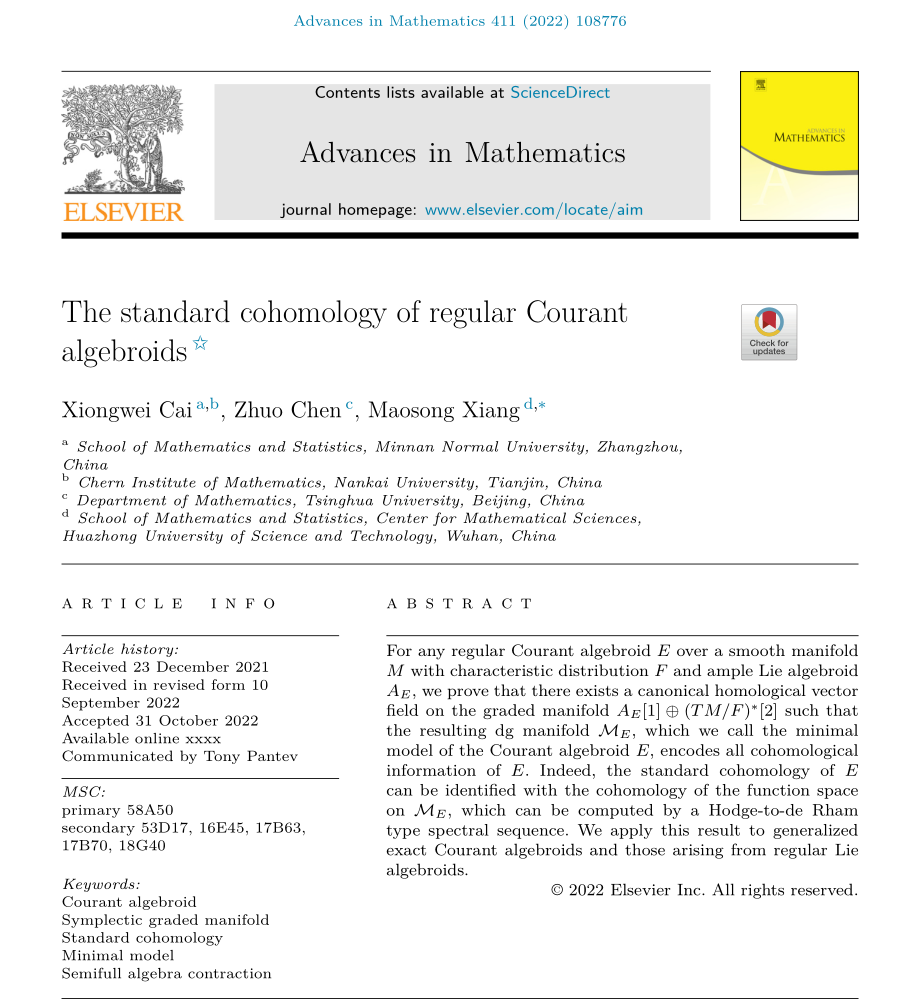 近日,粒计算重点实验室成员、数学与统计学院青年教师蔡雄伟博士与清华大学陈酌、华中科技大学向茂松两位老师合作,以第一作者并以我校为第一署名单位在国际顶级数学期刊《Advances in Mathematics》上发表题为《The standard cohomology of regular Courant algebroids》的学术论文。