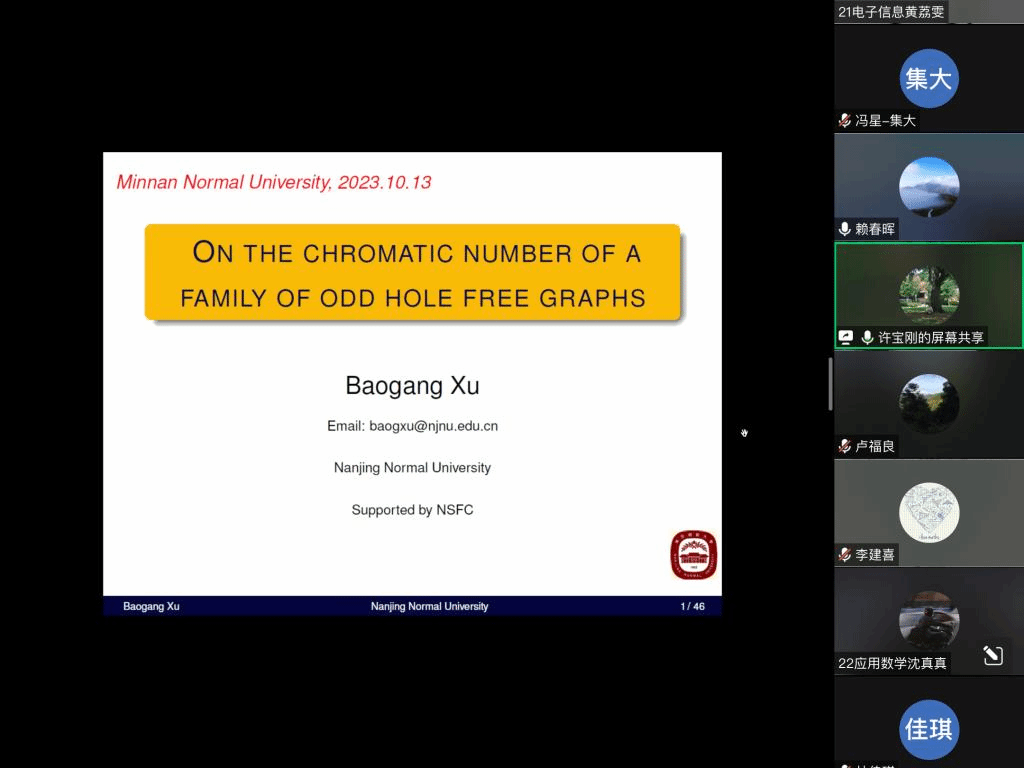 报告中,许宝刚教授主要介绍了hole是长度至少为4的导出圈,奇hole是奇数长度的hole。color[rgb]{0.6, 0.1, 0.4}{HVN}是由与K4中的边两端相邻的顶点组成的图。遵循Chudnovsky等人的思想和证明技术,我们确定了无(odd hole,HVN)图的色数(这是与Jialei Song的联合工作)。还介绍了有关该主题的一些未解决的问题。报告结束后,在座的师生就相关研究问题进行了探讨和交流。