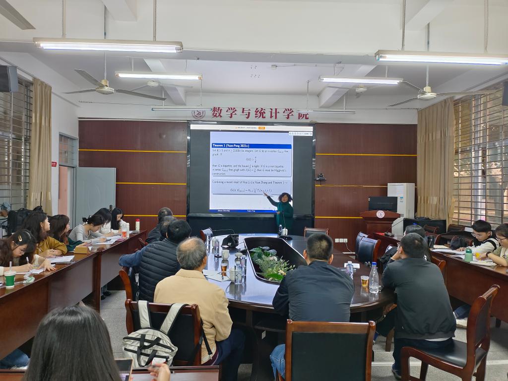 报告中,彭岳建教授主要介绍了禁止出现奇圈的图的最小度稳定性,确定最小度的紧界是什么,以保证n个顶点图禁止一系列奇圈是二部的。设C是奇圈族,我们发现C中不存在的最短奇圈的长度和C中最长奇圈的长度决定了紧界是什么。令l≤k且n≥1000k8为正整数。令C为奇圈族,C2l+1为C中以外的最短奇圈,C2k+1为C中最长的奇数循环。令BC2l+1(n)表示通过取2l+1个顶点不交的图Kn/2(2l+1)得到的图;任取一个顶点使得这些顶点形成长度为2l+1的q圈。请注意,BC2l+1(n)是无C且具有最小度为n/2(2l+1)的非二部图。令 C2k+3(n/2k+3)表示具有n个顶点的C2k+3的平衡扩张。请注意,C2k+3(n/2k+3)是无C且非二部的,具有最小次数n。我们证明,如果G是一个n个顶点无C的图,且δ(G)> max{n/2(2l+1),2n/2k+3},则G是二分图。BC2l+1(n)和C2k+3(n/2k+3)的界限很明显。此外,唯一具有最小度 max{n/2(2l+1),2n/2k+3}=n/2(2l+1)的n个顶点无C非二部图是BC2l+1(n),并且唯一具有最小度为max{n/2(2l+1),2n/2k+3}= n/2(2l+1)的n个顶点无C非二部图为C2k+3(n/2k+3)。我们的结果统一了Andrasfai、Erdos和Sos以及Hggkvist对于大n的稳定性结果。我们的结果也与Erdos和Simonovits的问题有关:对于整数r≥2和非二部图族H,α的紧界是多少,使得任何H无n顶点图的最小度数至少为αn的色数至多为r?对于r = 2和任何奇圈族,我们的结果回答了这个问题。报告结束后,在座的师生就相关研究问题进行了探讨和交流。