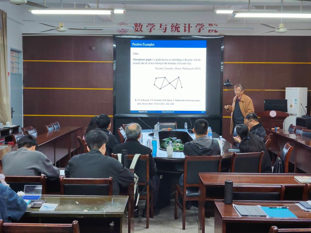 报告中,卫兵教授主要介绍了Bonds intersecting long paths in k-connected graphs的主题。1966年,Gallai提出了一个问题:是否存在一个顶点可以经过连通图的所有最长路径。虽然这已经针对某些特殊类型的图形进行了验证,如外平面图、圆弧图和序列-并行图,但对于一般图形来说,答案是否定的。在本次讲座中,我将介绍一些结果,其中包括如果我们用一个边代替顶点,那么答案是肯定的。一个图的{\it 割边}是一个最小的非空边割。特别地,在任何2-连通图中,与一个顶点相邻的所有边组成的集合是一个割边,称为顶点割。显然,对于一个2-连通图,路径经过一个顶点$v$当且仅当它与相对于$v$的顶点割相交。因此,回答Gallai的问题的一个非常自然的方法是研究是否存在一个割边与所有最长路径相交。设$p$为连通图的最长路径长度。我们证明对于任何2-连通图和3-连通图,存在一个割边与长度至少为$p-1$和$p-2$的所有路径相交,分别。对于任何$k$-连通图($k\geq 3$),我们证明存在一个割边与长度至少为$p-t+1$的所有路径相交,其中$t=\Big\lfloor\sqrt{\frac{k-2}{2}}\Big\rfloor$如果$p$是偶数,$t=\Big\lceil\sqrt{\frac{k-2}{2}}\Big\rceil$如果$p$是奇数。我们的结果也提供了类似于[P.-L. Wu, {\it Combin. Probab. Comput.}, 6 (1997), pp. 107--113; and S. McGuinness, {\it Combinatorica}, 25 (4) (2005), pp. 439--450]中给出的割边与长环相交的结果的类比。报告结束后,在座的师生就相关研究问题进行了探讨和交流。