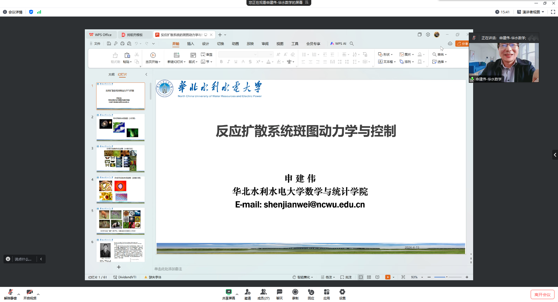 应ok138cn太阳集团529数学与统计学院和福建省粒计算及其应用重点实验室邀请,4月15日下午,华北水利水电大学申建伟教授在腾讯会议作了题为《反应扩散系统斑图动力学与控制》的报告。相关师生聆听了此次报告,报告由黄韩亮老师主持。