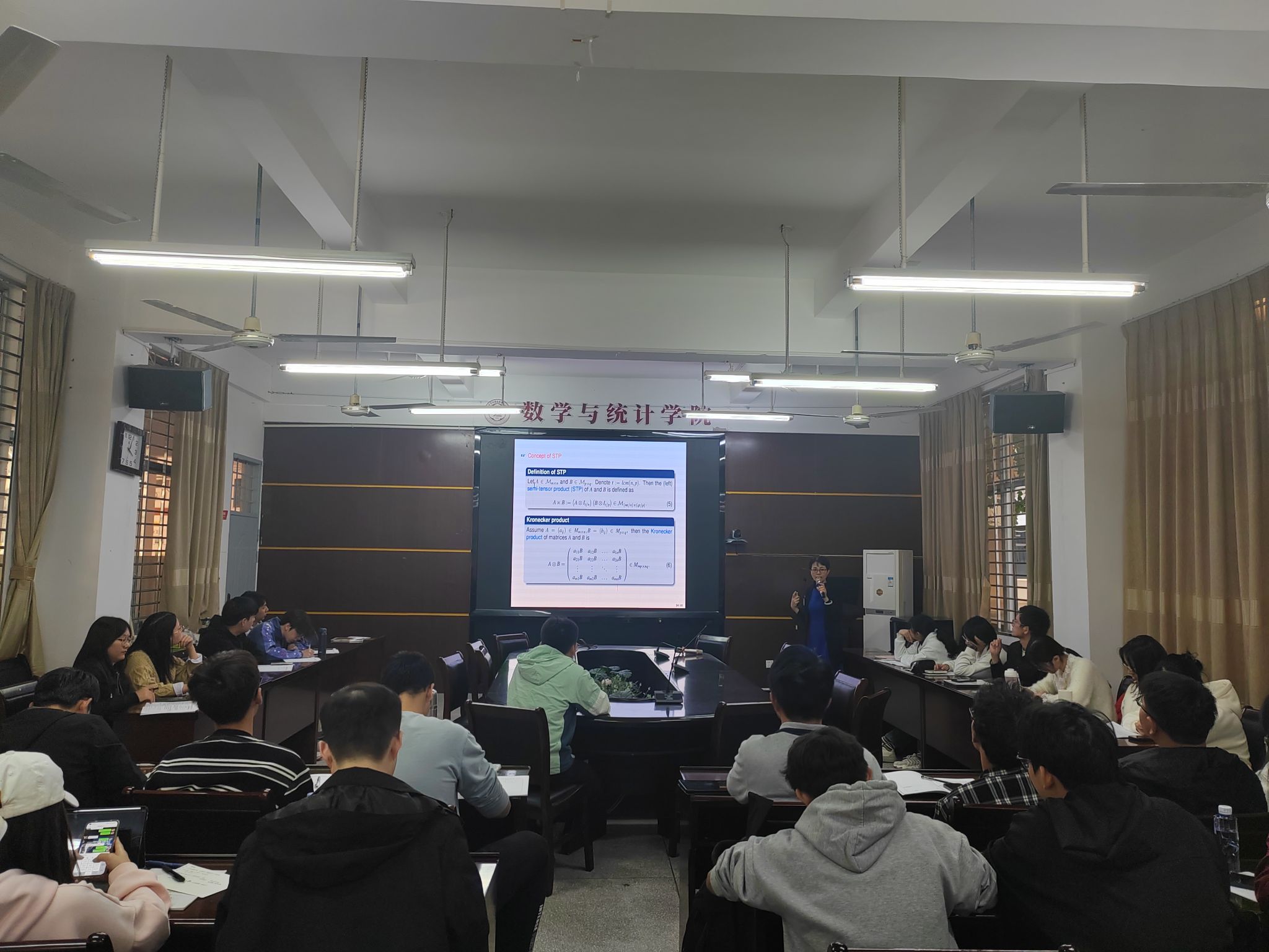 报告中,冯俊娥教授首先简单回顾了博弈的背景以及有限博弈的基本概念,包括势博弈,博弈的支付矩阵等。重点介绍了有限博弈的矩阵半张量积表示,主要包括在策略、局势的向量表示;支付函数的矩阵半张量积表示;策略更新动态方程的矩阵半张量积表示。最后简单介绍博弈的几种分类。报告结束后,在座的师生就相关研究问题进行了探讨和交流。