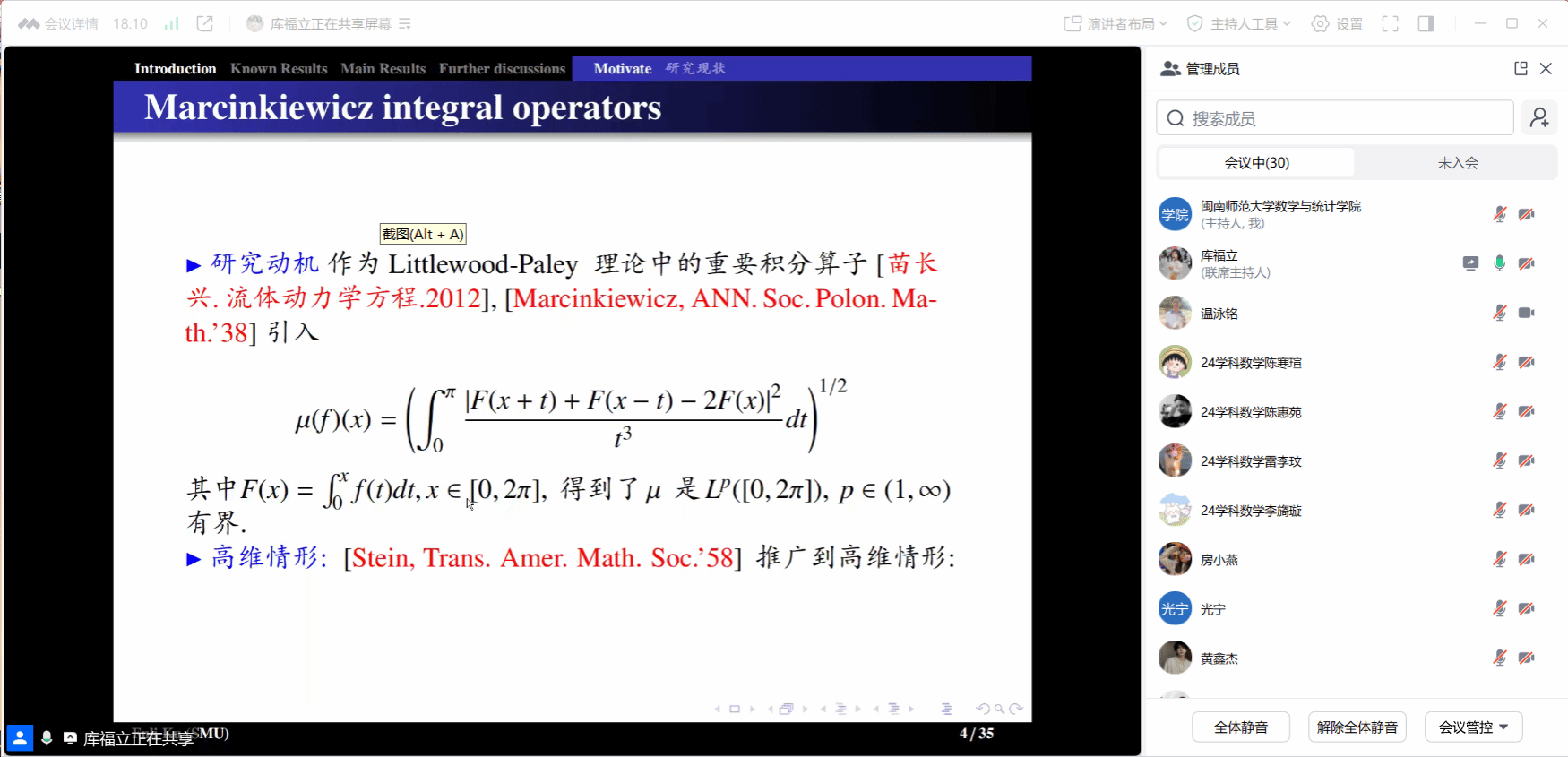 在此次讲座中,库福立博士深入且全面地介绍关于 Marcinkiewicz 积分算子对广义 Campanato 空间有界性的最新研究成果。该领域的研究长期以来备受关注,其对于深化我们对相关数学理论的理解有着不可忽视的作用。此外,库福立博士针对核在单位球面上满足 Lipschitz 连续的情况进行了深入分析,通过一系列复杂且精密的数学方法,得到了具有理论价值的估计结果。核在单位球面上的 Lipschitz 连续性质与算子有界性之间存在着紧密联系,对其进行精确估计,极大地完善了整个理论体系,也为后续相关研究提供了重要的参考与借鉴。