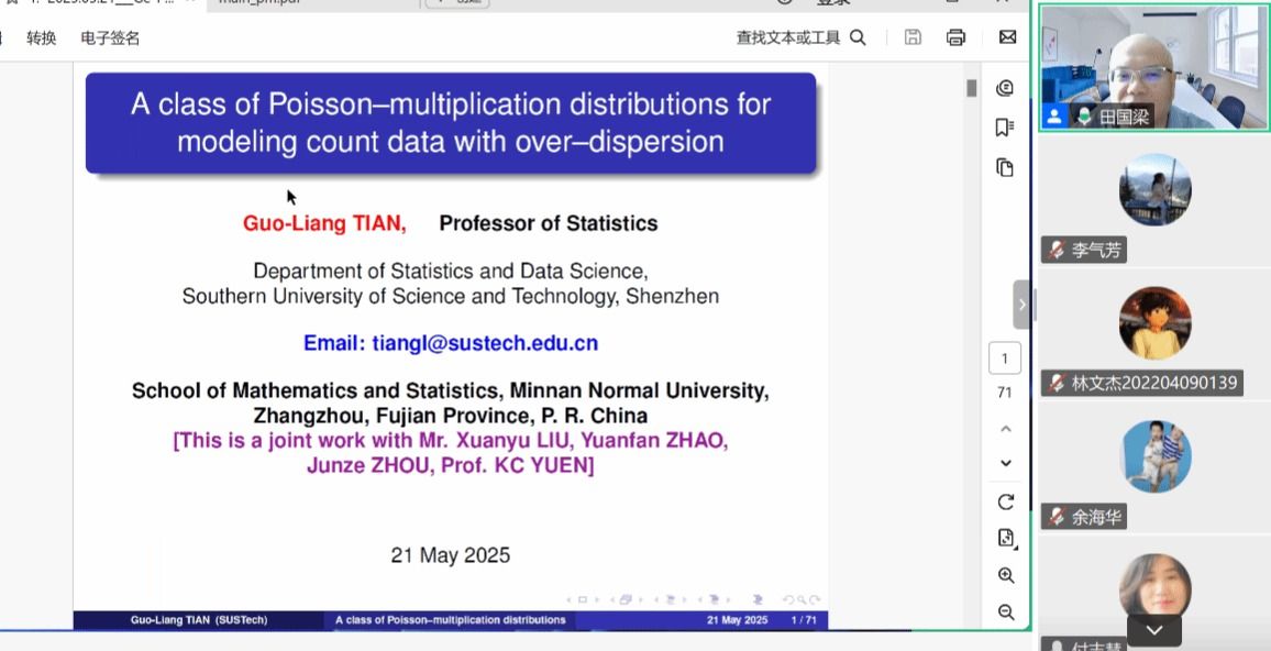 应ok138cn太阳集团529数学与统计学院和福建省粒计算及其应用重点实验室邀请,5月21日下午,南方科技大学田国梁教授在腾讯会议分别作了题为《A class of Poisson--multiplication distributions for modeling count data with over-dispersion(I)》和题为《A class of Poisson--multiplication distributions for modeling count data with over-dispersion(Ⅱ)》的两场讲座。相关师生聆听了此次讲座,讲座由施建华老师主持。
