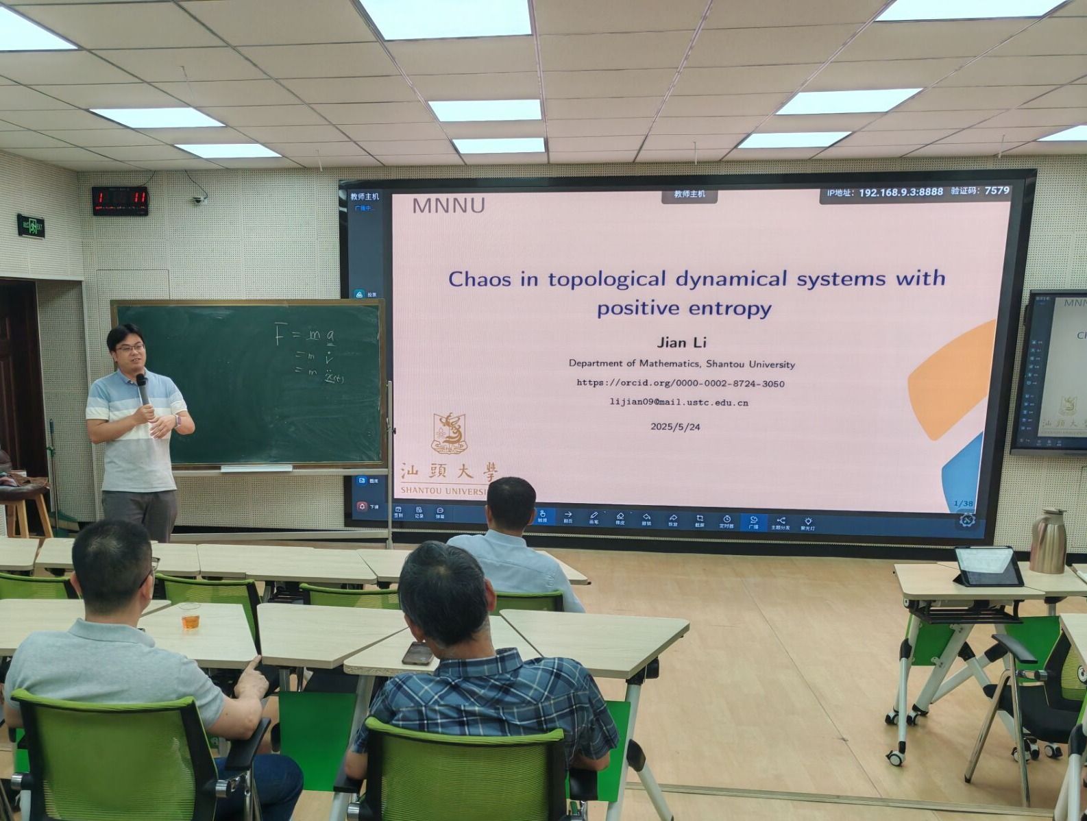 在讲座中,李健教授深入探讨了正熵拓扑动力系统中的各种混沌现象。他详细介绍了均值李-约克混沌(mean Li-Yorke chaos)、乘性熊氏混沌(multiply Xiong chaos)、半马蹄(semi-horseshoes)的存在性以及沿子序列的李-约克混沌等前沿研究成果。李教授通过丰富的理论分析和生动的实例,深入浅出地阐述了这些复杂而深刻的数学概念,使在场师生对正熵拓扑动力系统中的混沌现象有了更深入的理解。讲座结束后,与会师生与李健教授进行了热烈的互动交流,就正熵拓扑动力系统中的混沌现象、研究方法及其在实际问题中的应用等问题进行了深入探讨。本次讲座的成功举办,为我校师生提供了一个与国际知名专家交流的平台,拓宽了师生的学术视野,激发了他们对动力系统与混沌理论研究的兴趣和热情。