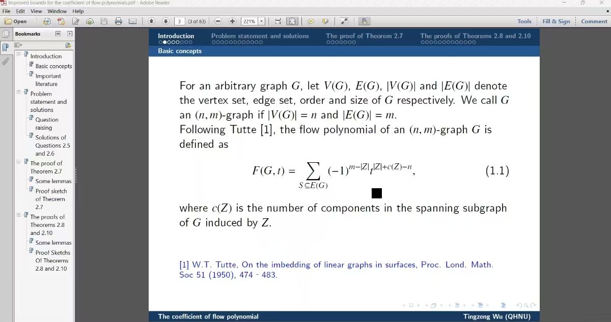 讲座中,吴廷增教授首先为听众详细介绍了一个连通的无桥(n, m)图,该图允许存在环和重边,F(G, t) 表示G的流多项式。Dong和Koh建立了F(G, t) 展开式中系数绝对值的一个上界。在本次报告中,吴延增教授及其研究团队对上述界进行了优化。此外,吴延增教授及其研究团队证明了如果G是一个所有流根均为实数的连通无桥三次图,特别地,如果G是一个所有流根均为实数的简单连通无桥三次图,那么展开式中系数有特殊的结论。