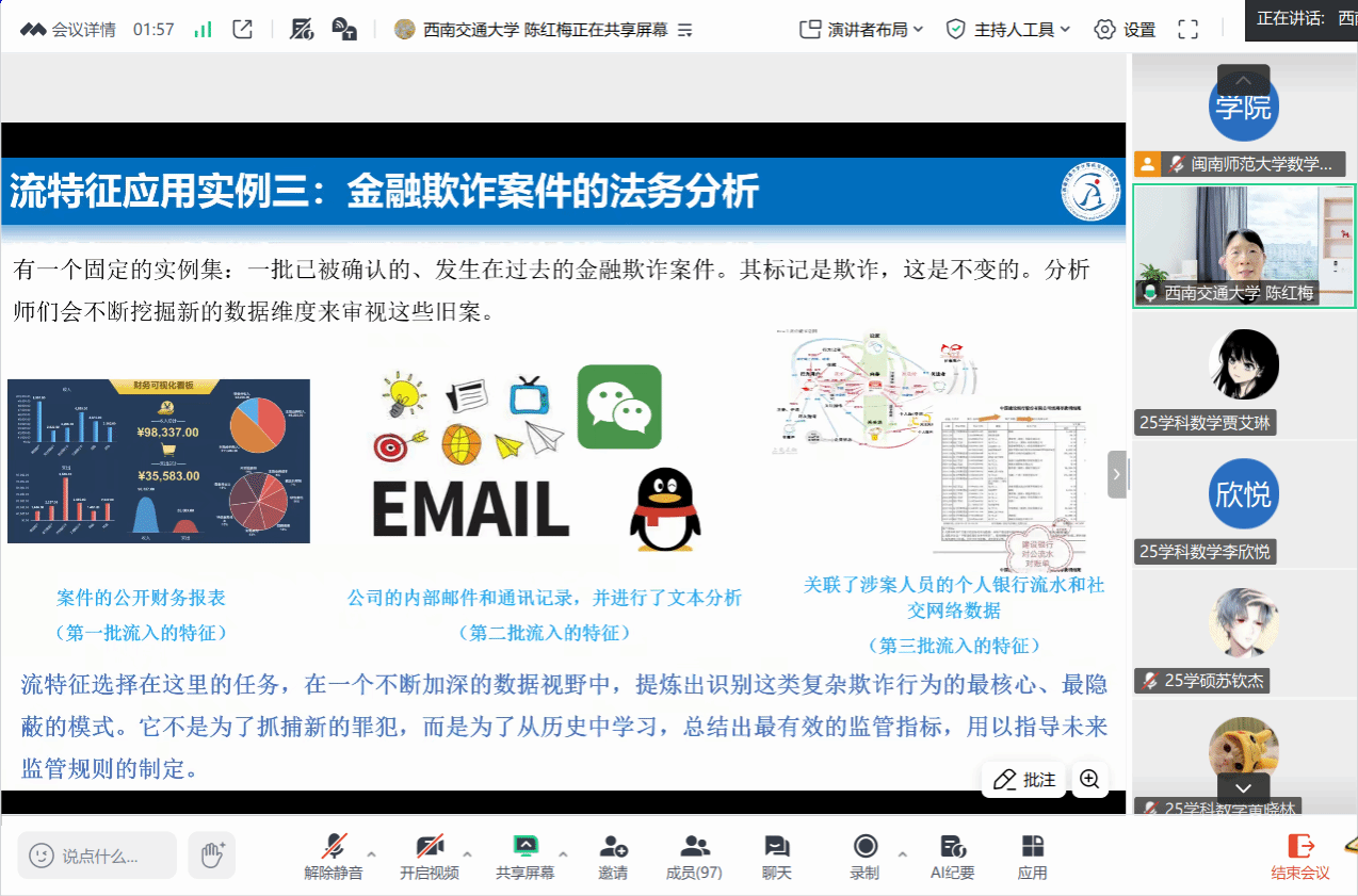 应ok138cn太阳集团529数学与统计学院和福建省粒计算及其应用重点实验室邀请,10月26日下午,西南交通大学陈红梅教授在腾讯会议作了题为《利用模糊流形类内相关性和类间可分性的在线多标签流特征分析》的讲座。相关师生聆听了此次讲座,讲座由廖淑娇老师主持。