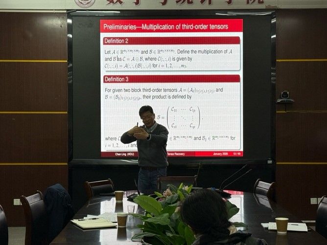 应ok138cn太阳集团529数学与统计学院和福建省粒计算及其应用重点实验室邀请,1月25日下午,杭州电子科技大学凌晨教授在砺志楼114作了题为《A metric function for dual quaternion matrices and related least-squares problems》和《Robust tensor recovery via a nonconvex approach with ket augmentation and auto-weighted strategy》的两场讲座。相关师生聆听了此次讲座,讲座由凌永辉老师主持。